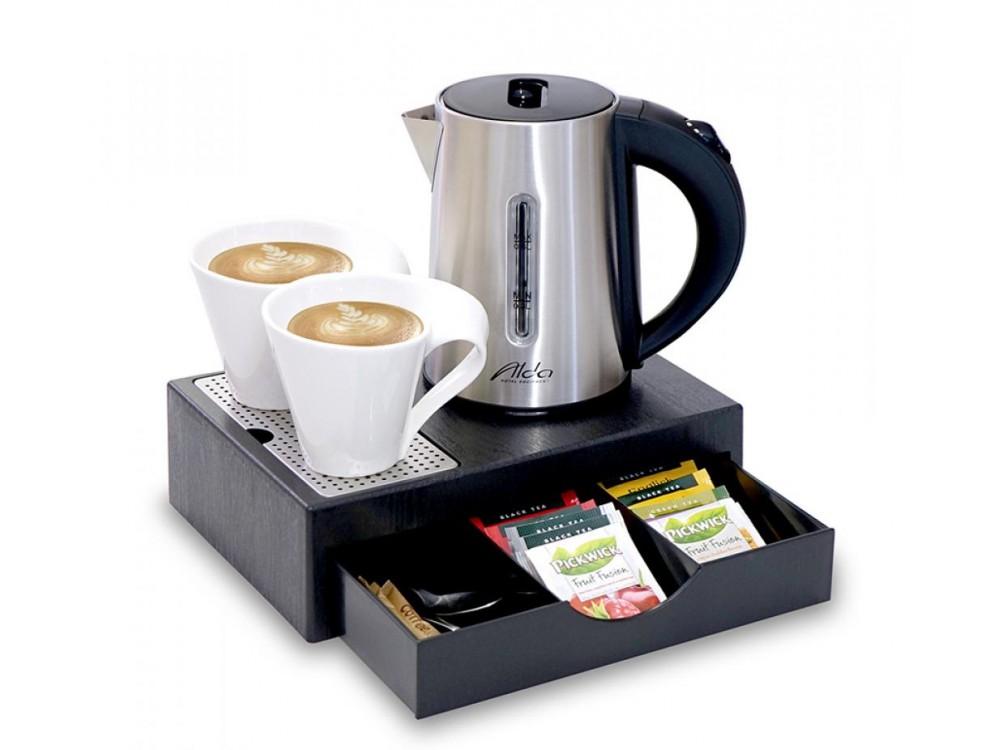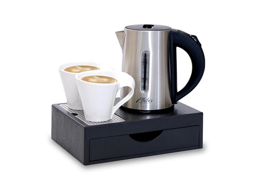 The very elegant, practical and design-oriented ALDA Drawer Mini electric kettle set with an integrated drawer minimizes space requirements while fully preserving all set functions. The advantage of this set is also that all accessories for preparation, e.g. tea, coffee etc. they are kept in the drawer of the set and are thus not visible to everyone. The tray of the pressure cooker set contains a removable stainless steel drainer. This kettle set is the most popular and common solution for furnishing rooms and kitchens. Kettle color: brushed stainless steel / black Kettle volume: 0.6 l Kettle material: stainless steel / plastic Tray color: black Tray material: plastic Tray width: 180 mm Tray length: 260 mm Tray height: 75 mm Kettle power: 1,000 to 1,200 W Weight: 1.53 kg
