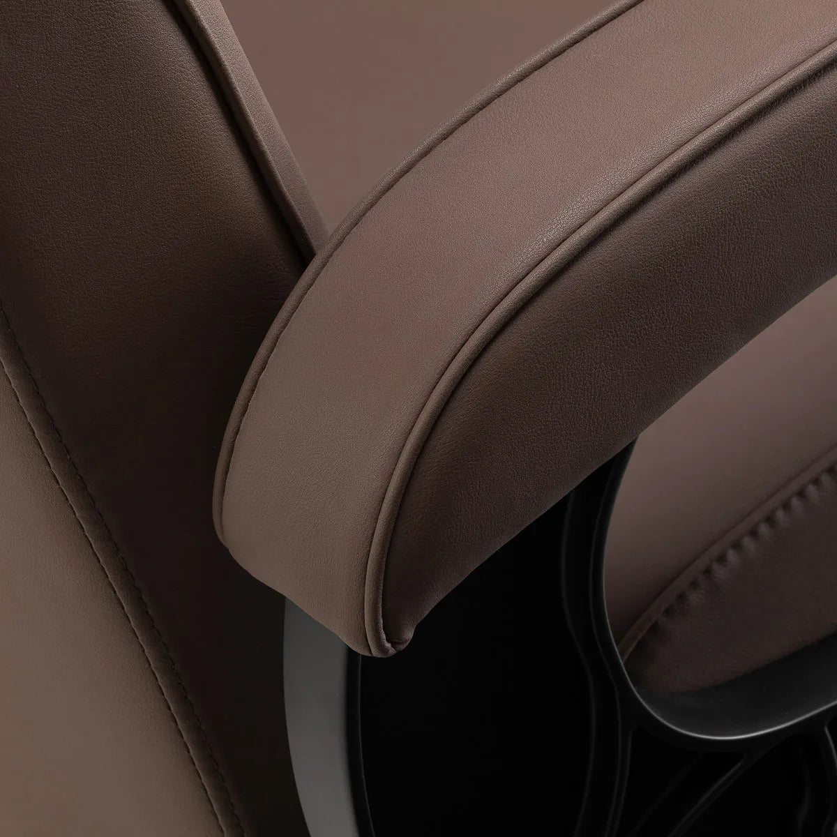 The seat filled with soft foam provides a high level of comfort for the client, even during longer treatments. The ergonomically shaped backrest supports the back and allows for a comfortable position, resulting in greater relaxation and a better treatment experience. The chair's full swivel mechanism increases freedom of movement, facilitating access from all sides and improving the stylist's workflow. The upholstered armrests, set at the optimum height, support the natural positioning of the arms and prevent tension in the shoulder and neck area.