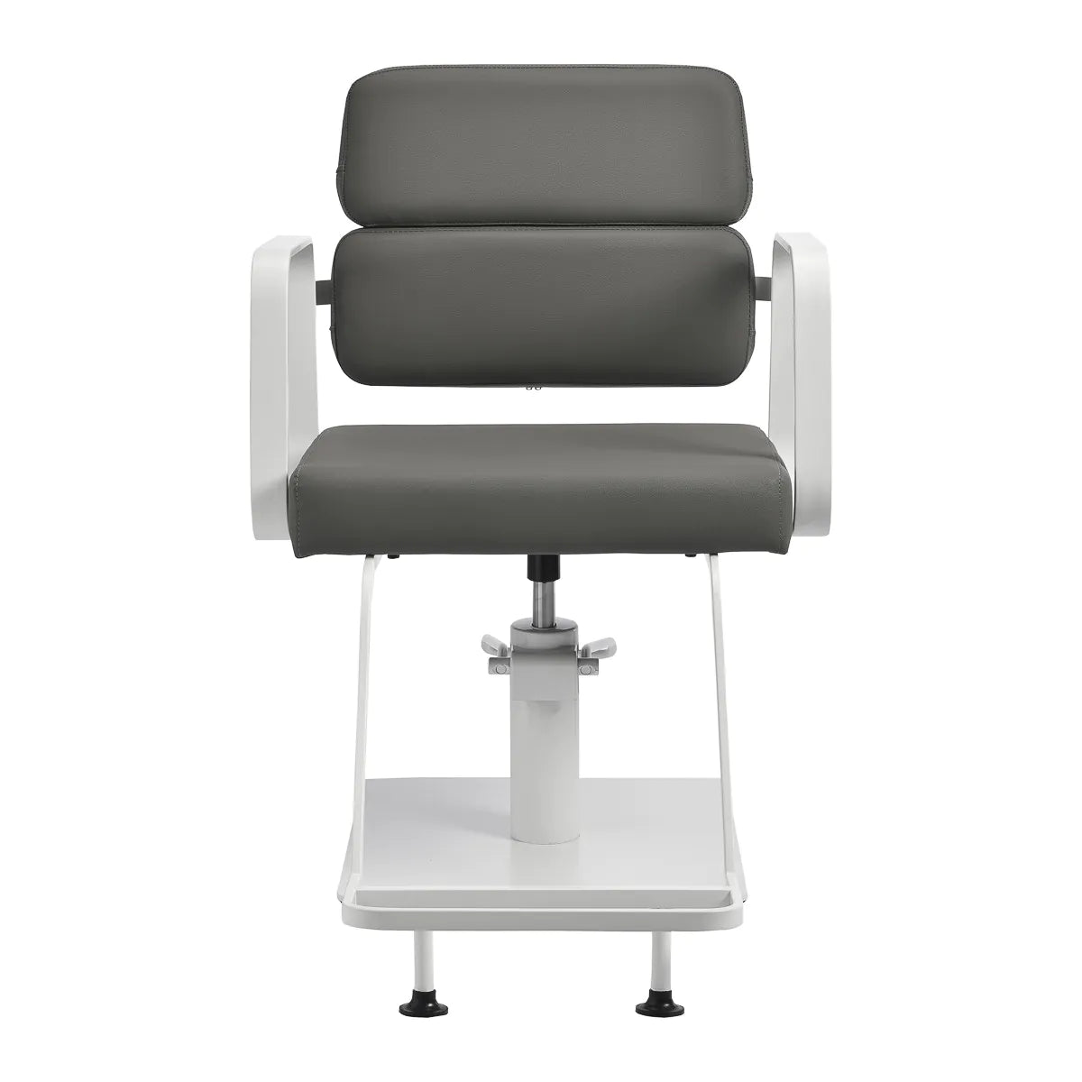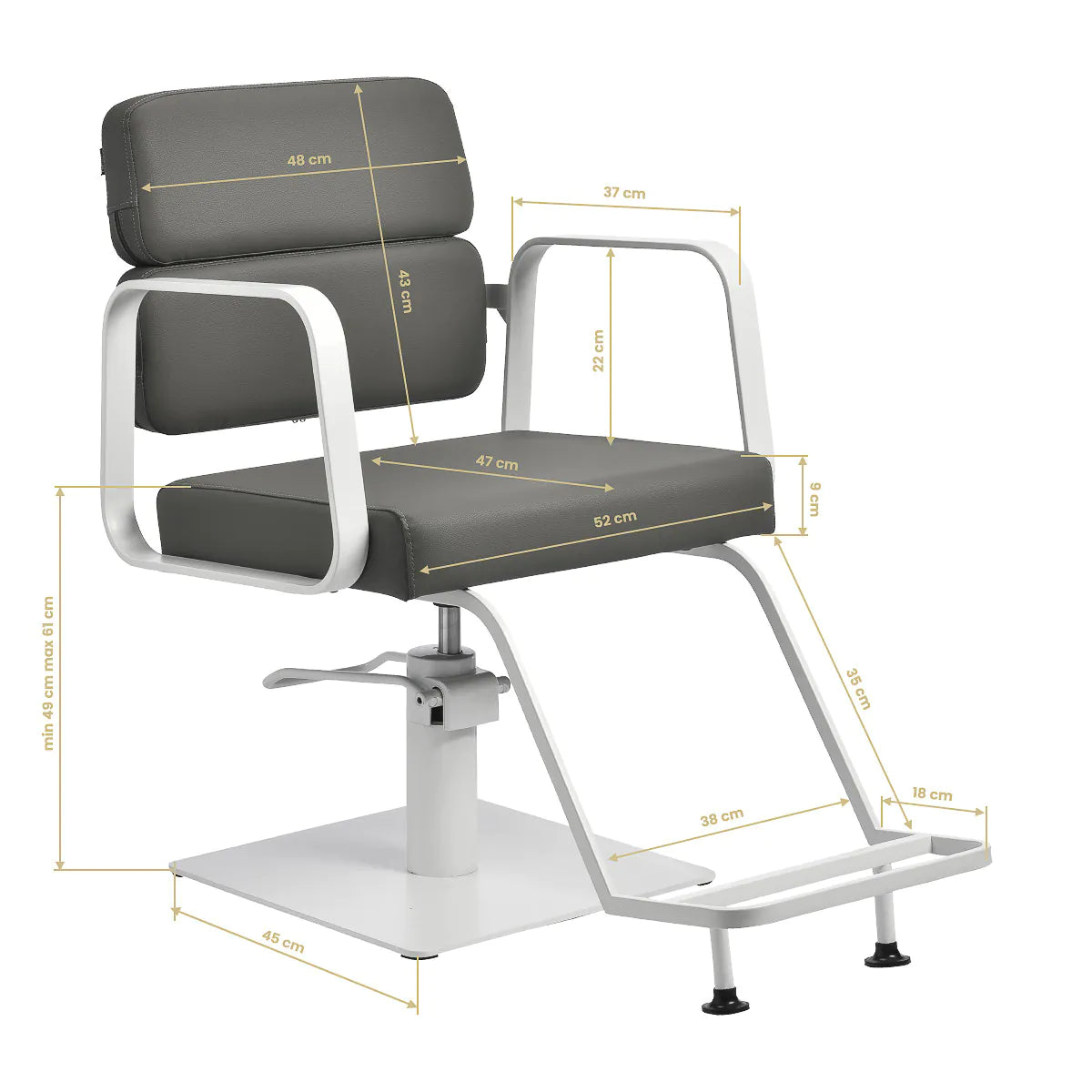 The full rotation mechanism of the chair makes the hairdresser's work more effective and comfortable. A solid, flat, square-shaped base guarantees stability during use. The matte-finished, smooth surface gives the element an elegant look and makes it easy to keep clean. A comfortable seat with foam filling ensures high comfort of use, even during many hours of treatments. Geometric, metal armrests allow for the correct positioning of the client's shoulders – this means that he does not bury his head in his shoulders or slouch – which makes it much easier to perform precise treatments, including haircuts. A stylish footrest dedicated to this model provides stable support for the user's feet.
