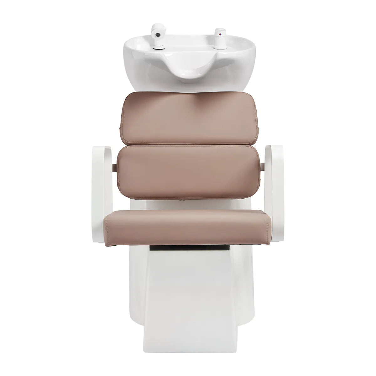 The practical hair wash unit is equipped with a mixer faucet, which provides easy access to hot and cold water. This makes it easier to adjust the temperature to the customer's individual preferences. A dedicated place to hang up the handset makes work easier, and the chrome-plated plug with a special strainer allows you to control the water flow and maintain high hygiene standards in the salon. The water connection has been placed inside the base, allowing the pipes to be easily hidden. A significant advantage of this model is the opening left between the backrest and the seat, which makes it easier to keep the living room clean by allowing you to easily sweep dirt from every nook and cranny of the chair. The hair wash unit has been designed in such a way as to ensure comfort during various treatments, ensuring proper back support. The combination of functionality and amenities makes working in a hairdressing salon even more comfortable.