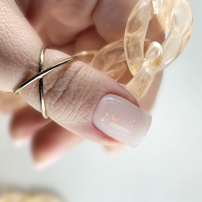 Fabulous and subtle, very bright and natural, milky-pink shade. Blends perfectly with the natural nail at the cuticle line. Contains foil flakes shimmering in different colors: aquamarine, gold, copper, purple, pink and lavender. Due to the fact that the base is less pigmented, the gloss is definitely stronger. The product strongly stiffens natural nails, it is perfect for medium-hard and soft, brittle nails that require strengthening.