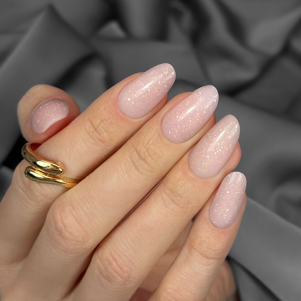 Cute Ariel gel is a builder gel in a beautiful flesh-toned peach shade, enriched with multicoloured particles that shimmer in shades of gold, copper, pink and celadon. The overall effect creates a warm, subtly shimmering effect. The product is perfect for both uniform nail extensions and a variety of decorative designs.