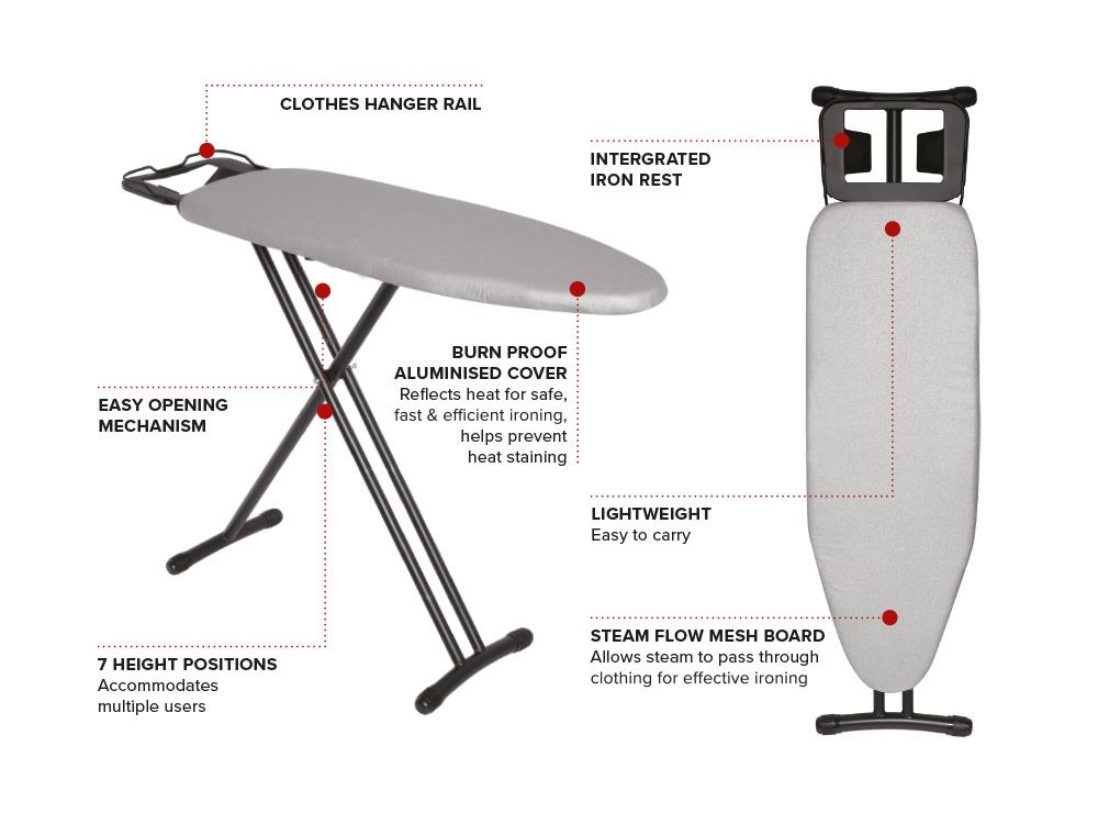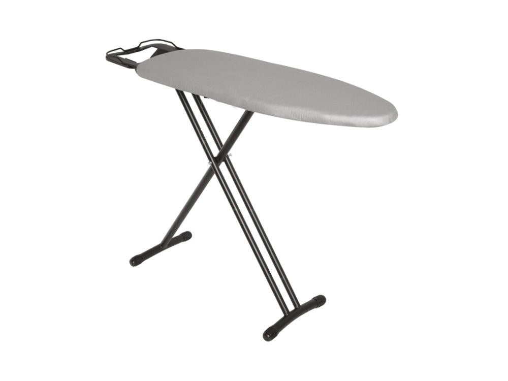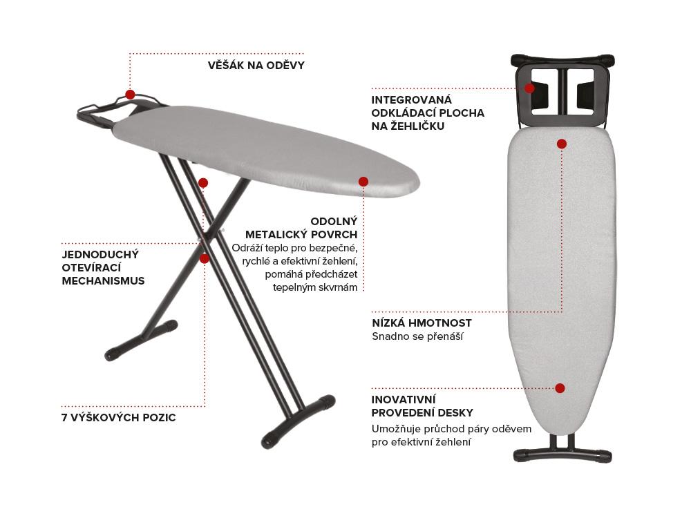 Barva desky: světle šedá Barva konstrukce: tmavě šedá Hmotnost: 3,60 kg Délka desky: 1 240 mm Šířka desky: 360 mm Výška desky: 65 mm Délka žehlící plochy: 940 mm Šířka žehlící plochy: 330 mm Konstrukce: odolné nohy a rám s černým práškovým nástřikem Polohovatelnost: 7 výškových poloh Žehlicí polohy: 7 pozic s odolností 35 vysokými teplotami potahu: potah - odolný proti vysokým teplotám 665 pohliníkovaná textilie, vyměnitelná
