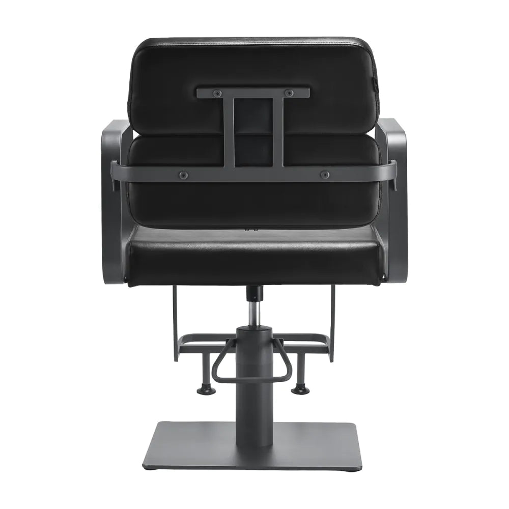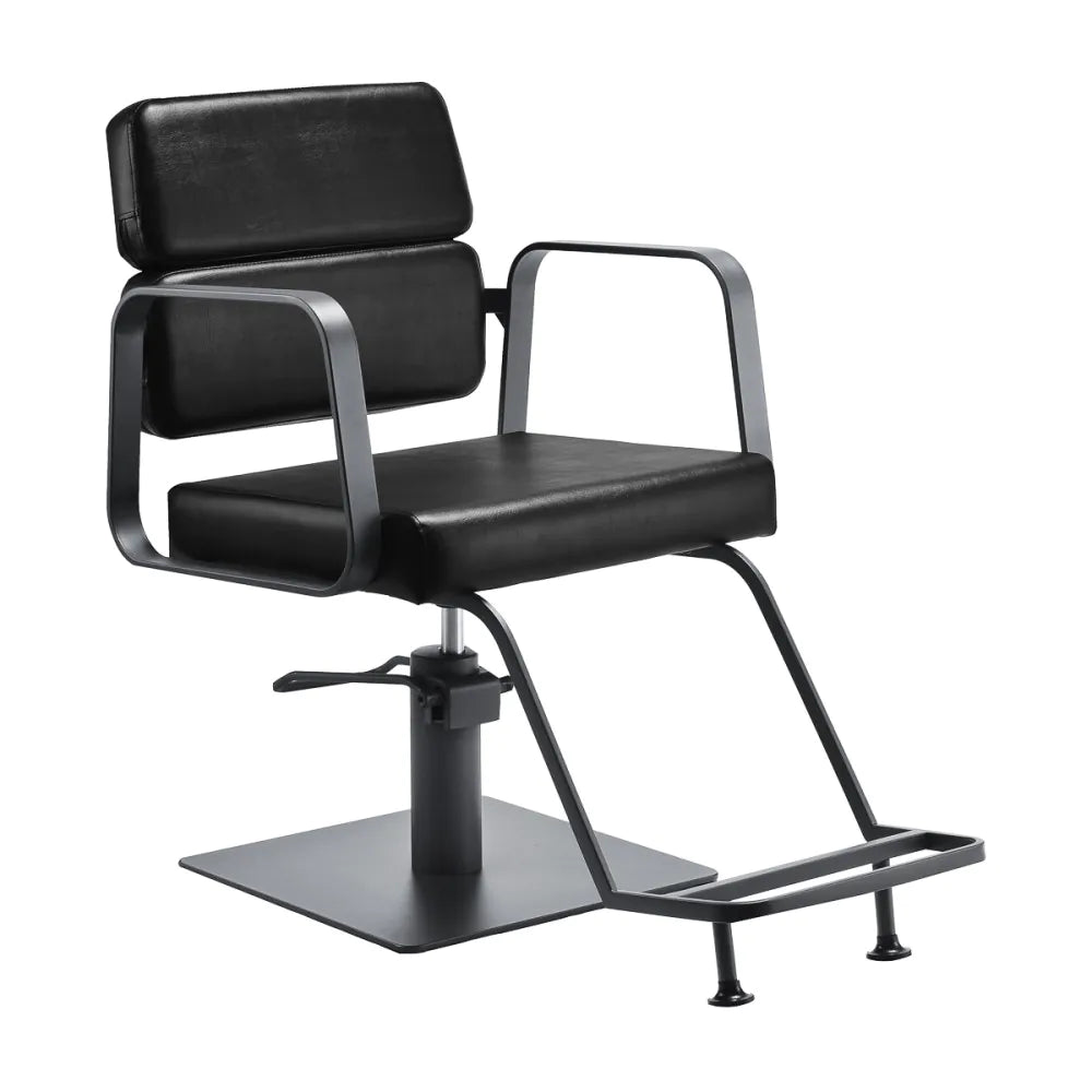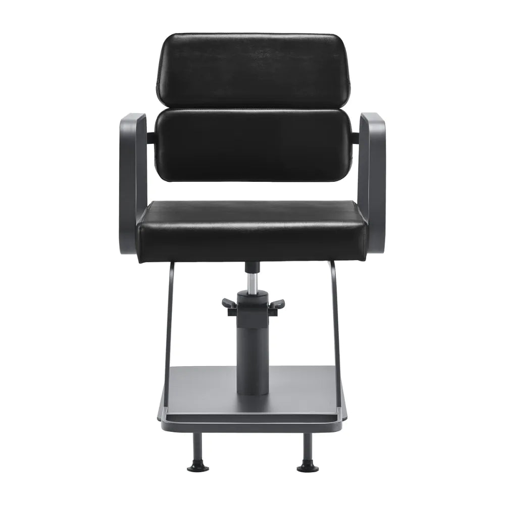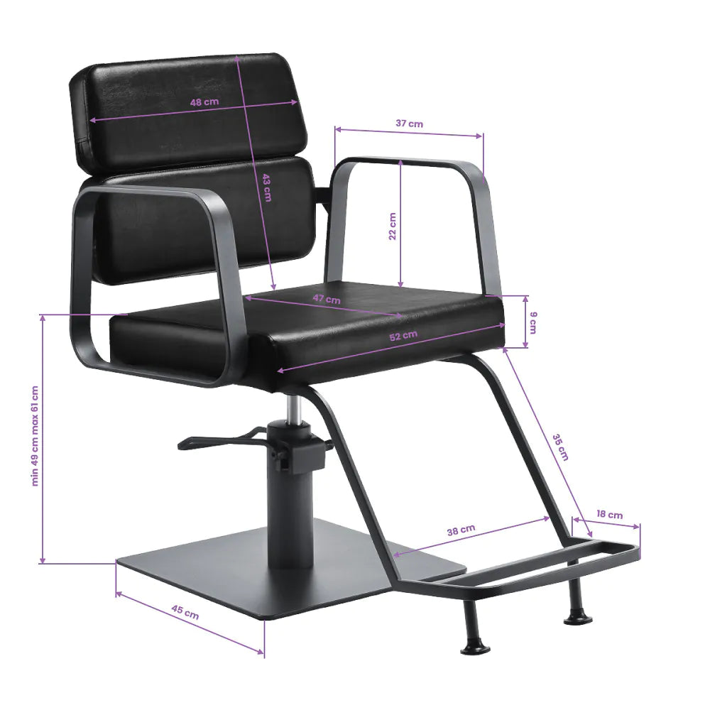 Mechanismus plné rotace křesla usnadňuje kadeřníkovi práci efektivnější a pohodlnější . Pevná, plochá, čtvercová základna zaručuje stabilitu během používání. Matný, hladký povrch dodává prvku elegantní vzhled a činí ho snadno se udržuje v čistotě . Pohodlné sedátko s pěnovou výplní zajišťuje vysoký komfort používání , a to i během mnohahodinových ošetření. Geometrické kovové opěrky rukou umožňují správné umístění ramen klienta – to znamená, že si nezabořuje hlavu do ramen ani se nehrbí – což výrazně usnadňuje provádění přesných ošetření , včetně stříhání vlasů. Stylová opěrka nohou určená pro tento model poskytuje stabilní oporu pro nohy uživatele.