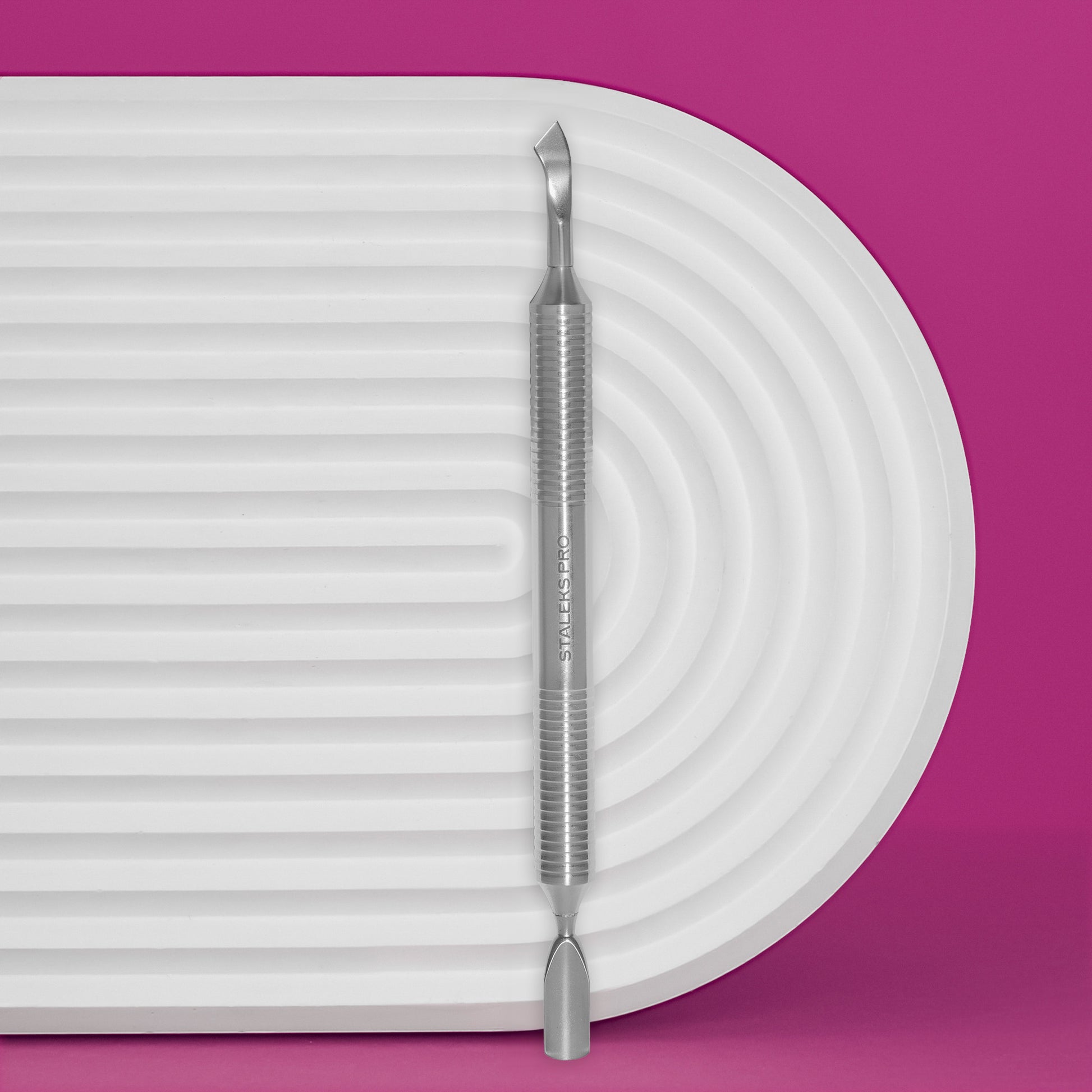 Dutý zatlačovač na manikúru (zaoblený zatlačovač + zahnutá čepel). Odsunovače jsou lehké díky duté rukojeti, která nezatěžuje ruku technika. Pohodlné uchopení čepelí poskytuje zvýšený průměr rukojeti; nástroj díky novým zářezům neklouže z ruky. Pracovní část "zaoblený posunovač" je navržena tak, aby zvedla a zatlačila kůžičku; je vhodné pracovat se širokou nehtovou deskou. Pracovní část, "ohnutá čepel", je určena k čištění nehtové ploténky od pterygia. Profesionální ruční ostření. Vysoce legovaná nerezová ocel. Odolné vůči sterilizaci v peci a autoklávu. Může být dezinfikován speciálními prostředky. Doporučeno pro manikúru a pedikúru. Klíčové vlastnosti