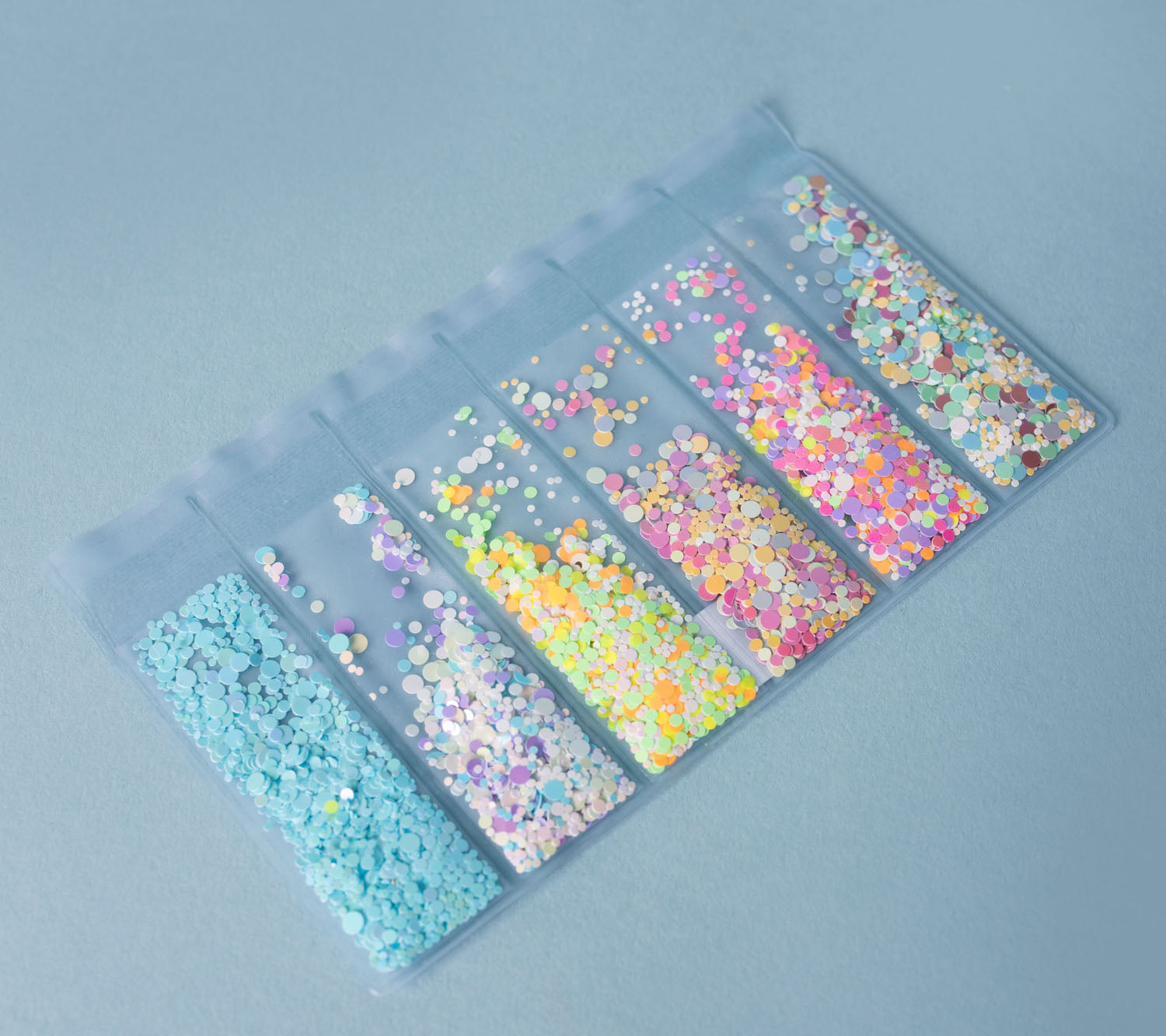 Sada 6 lesklých sad dekorací, které využijete na mnoho způsobů jak v kosmetickém salonu, tak i doma. Barevné částice dodají kouzlo každému stylingu.