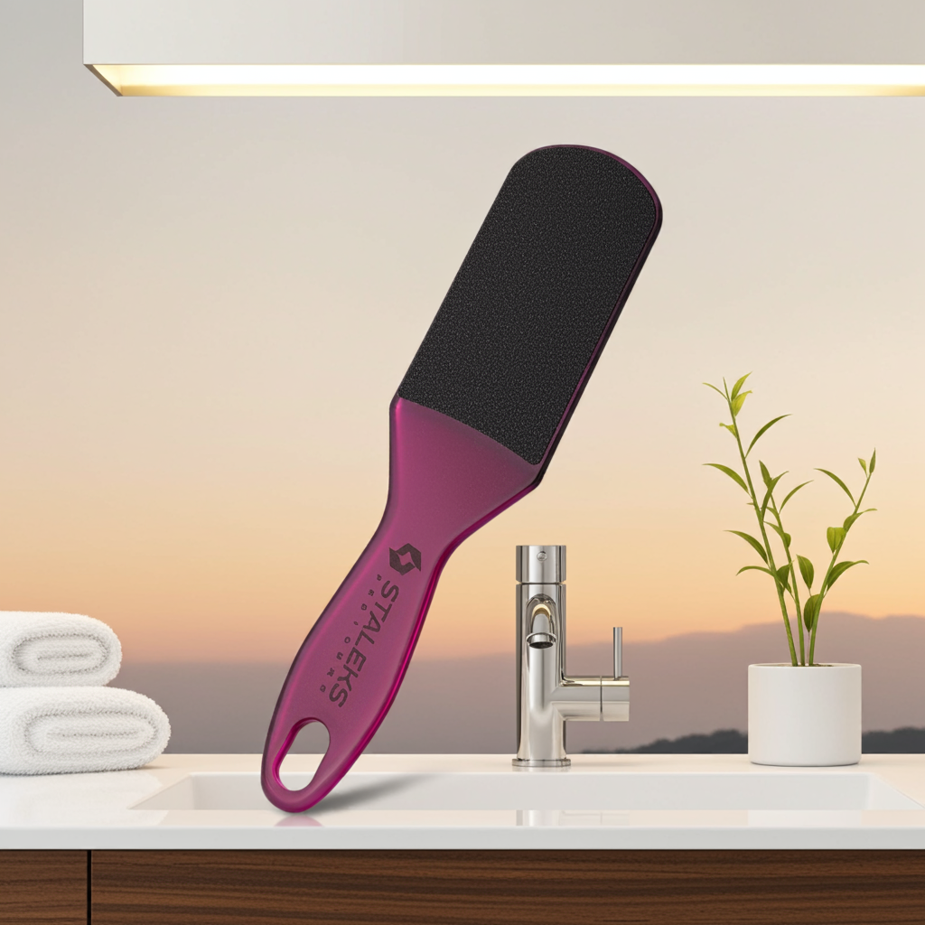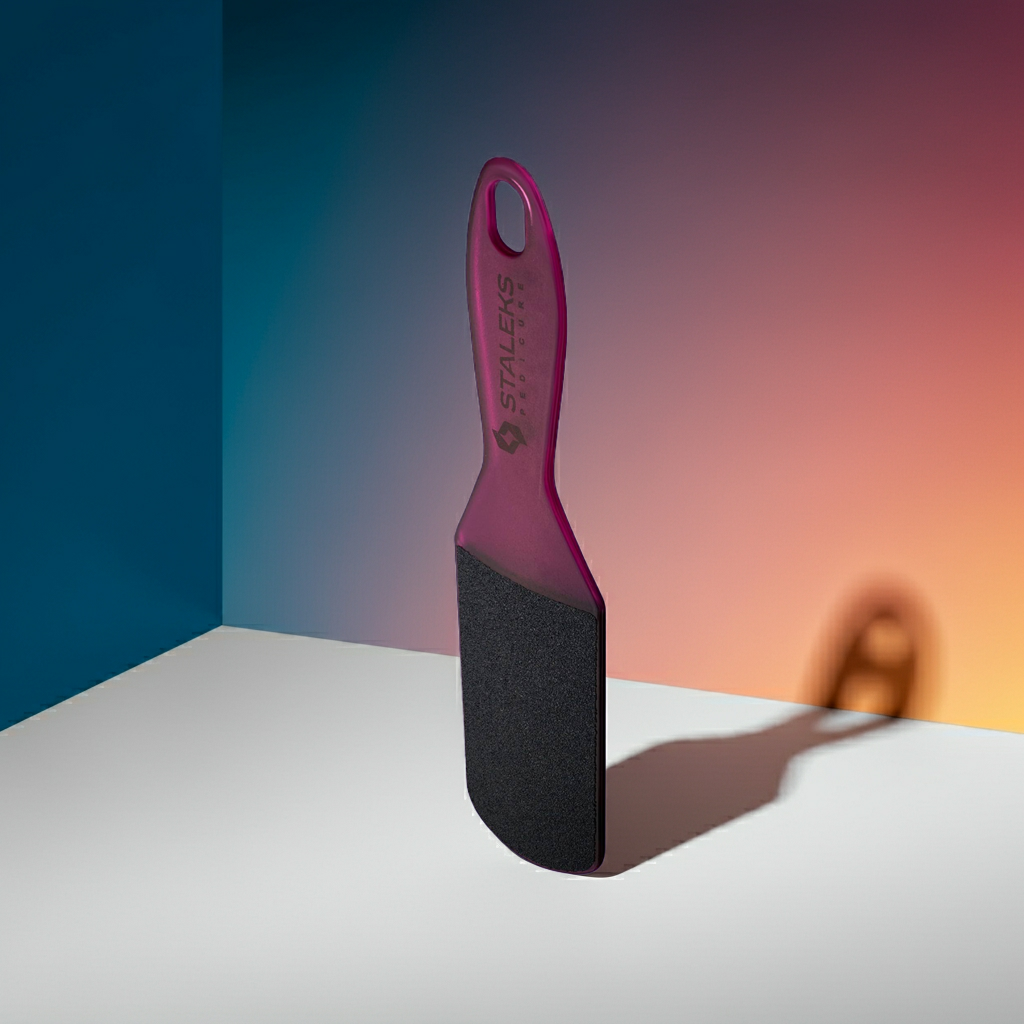 Pilník na nohy. Odolný, neohýbající se plast. Dva typy hodnot zrnitosti pracovní plochy pro kůži různého stupně drsnosti. Abrazivita zrnitost 60/80 pro odstranění tvrdých kuřích ok, silně zdrsněné kůže. Pohodlný tvar pilníku na nohy - jedna strana pracovní plochy je konvexní a druhá je konkávní. Zvětšená plocha pracovní plochy umožňuje rychle odstranit hrubou kůži potřebným abrazivem. Snížení únavy ruky během procedury díky malé hmotnosti nástroje. Bezpečné umístění pilníku do ruky díky ergonomické rukojeti. Nebojí se vlhkosti, lze prát a dezinfikovat. Má dlouhou životnost. Používá se k provádění pedikúry.Klíčové funkce