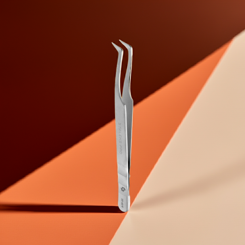 Profesionální kleštičky na řasy (botička, 75'). Vhodné pro všechny typy objemového modelování 2D až 8D. Široké pracovní hrany. Rovné rukojeti. Pohodlná pracovní část pinzety, úzké okraje umožňují práci ve vnějších i vnitřních koutcích oka. Měkký a hladký uzávěr snižuje únavu ruky během procedury díky třem radiusovým drážkám na těle pinzety. Pevné sevření materiálu díky rovnoměrnému uzavření pracovních hran po celé ploše, pracovní 'nos'. Profesionální ruční ostření pracovních ploch zabraňuje riziku lámání a deformace řas. Profesionální broušení a leštění výrazně prodlužuje životnost pinzety a zabraňuje ulpívání lepidla. Saténový matný povrch s nízkým reflexním efektem zabraňuje klouzání v ruce. Vyrobeno z vysoce kvalitní nerezové oceli pro odolnost proti korozi a dlouhou životnost. Všechny metody dezinfekce a sterilizace jsou povoleny. Klíčové vlastnosti