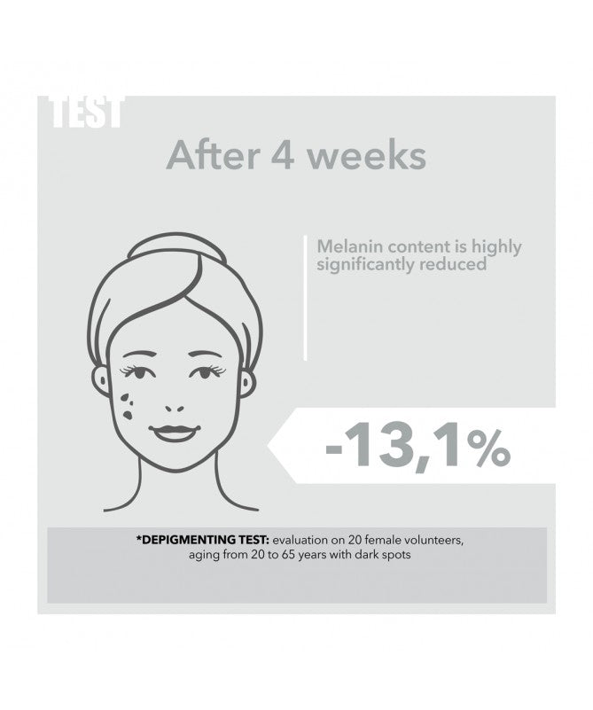 Koriguje a viditelně snižuje intenzitu tmavých skvrn regulací syntézy melaninu a prevencí tvorby nových. Pravidelné používání minimalizuje výskyt tmavých skvrn a pleť vypadá sjednoceněji a jasněji.